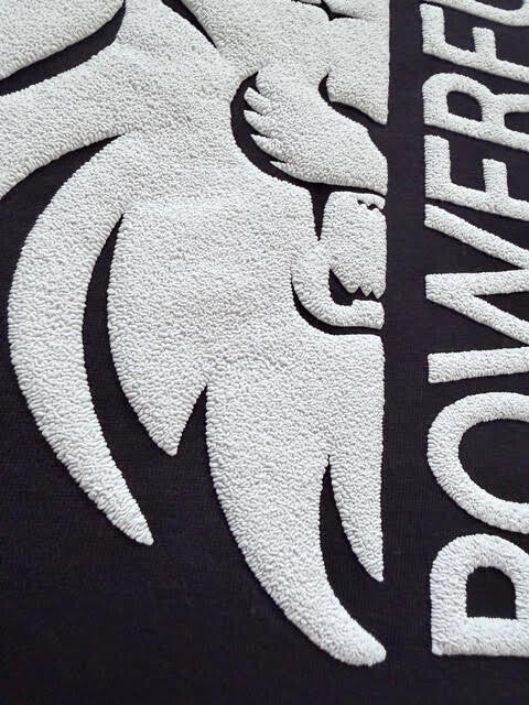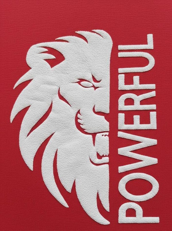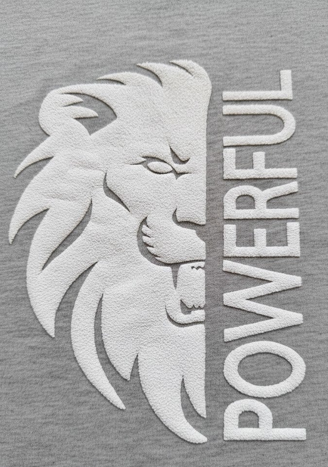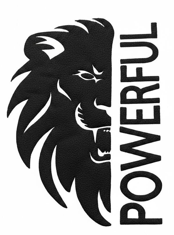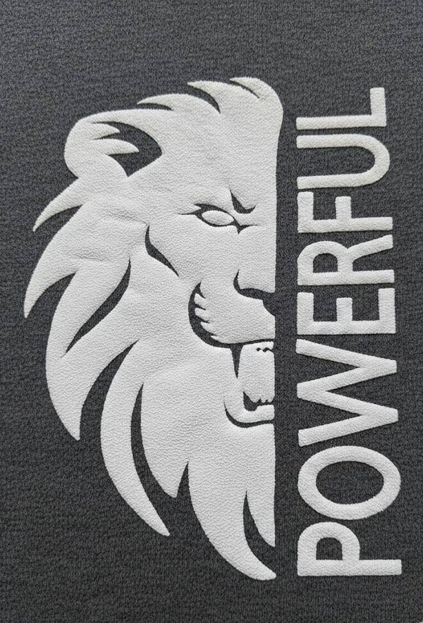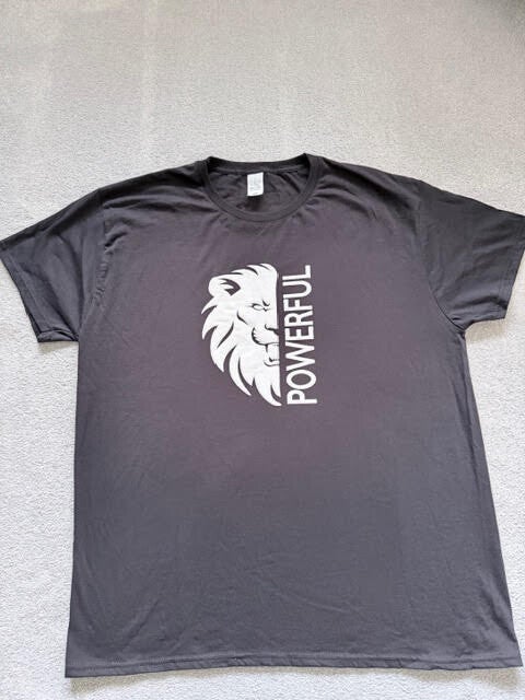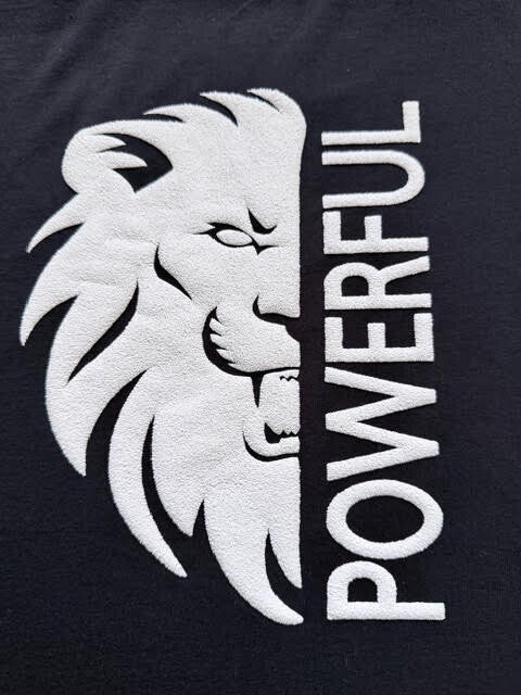 A half lion face design with the word POWERFUL in raised print; if a white T-shirt is chosen, the print will be in black.