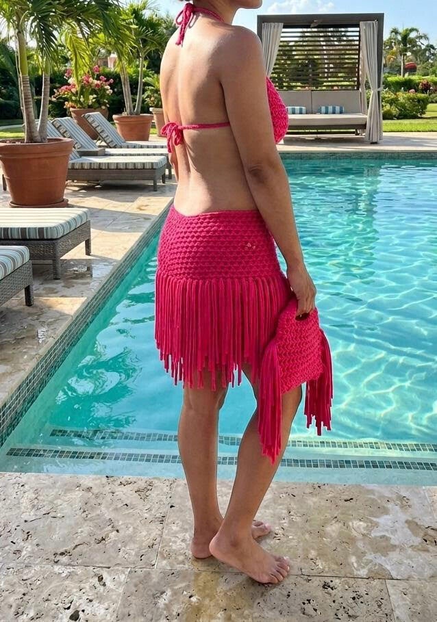 Matching Handbag: A small, structured "grab bag" or tote made from the same pink crochet material, featuring matching fringe hanging from the sides to tie the whole look together.